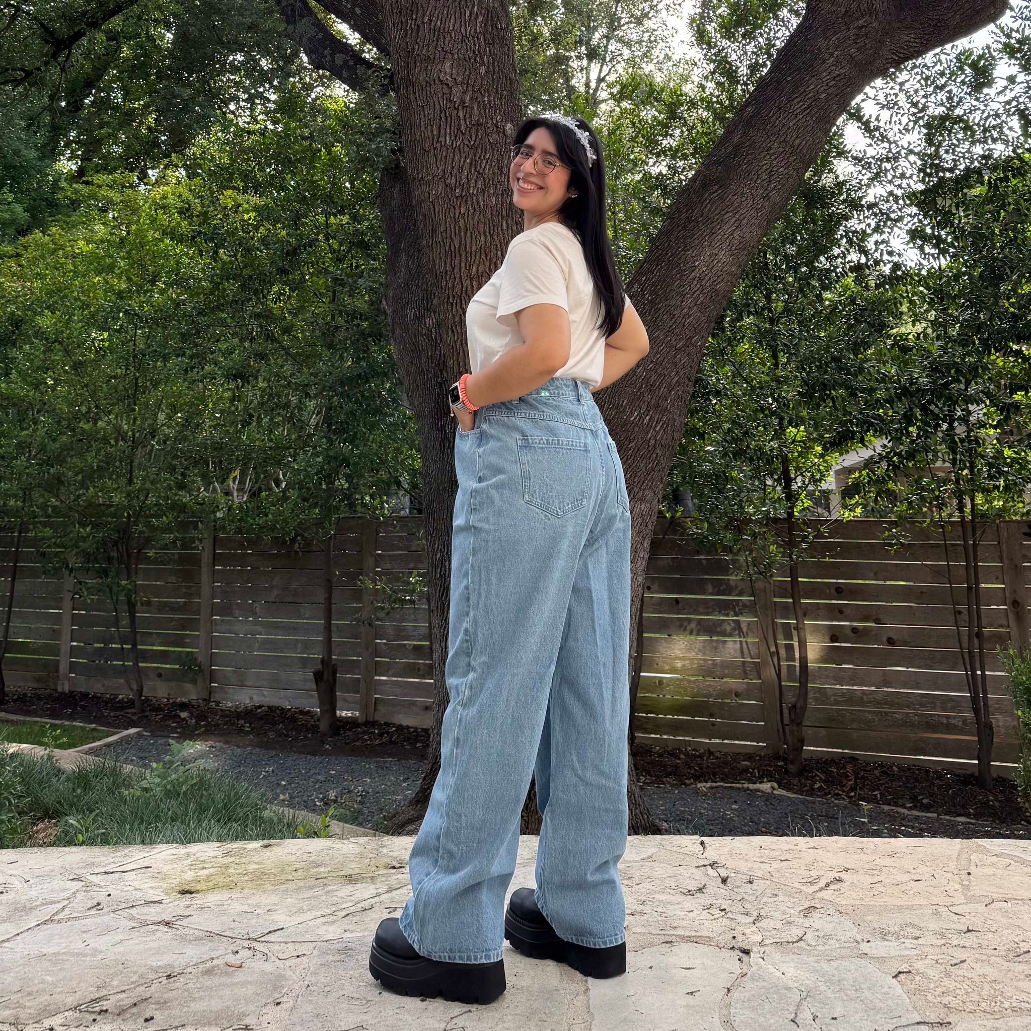 The jeans are meant to be fitted at the waist and a bit loose around the legs.