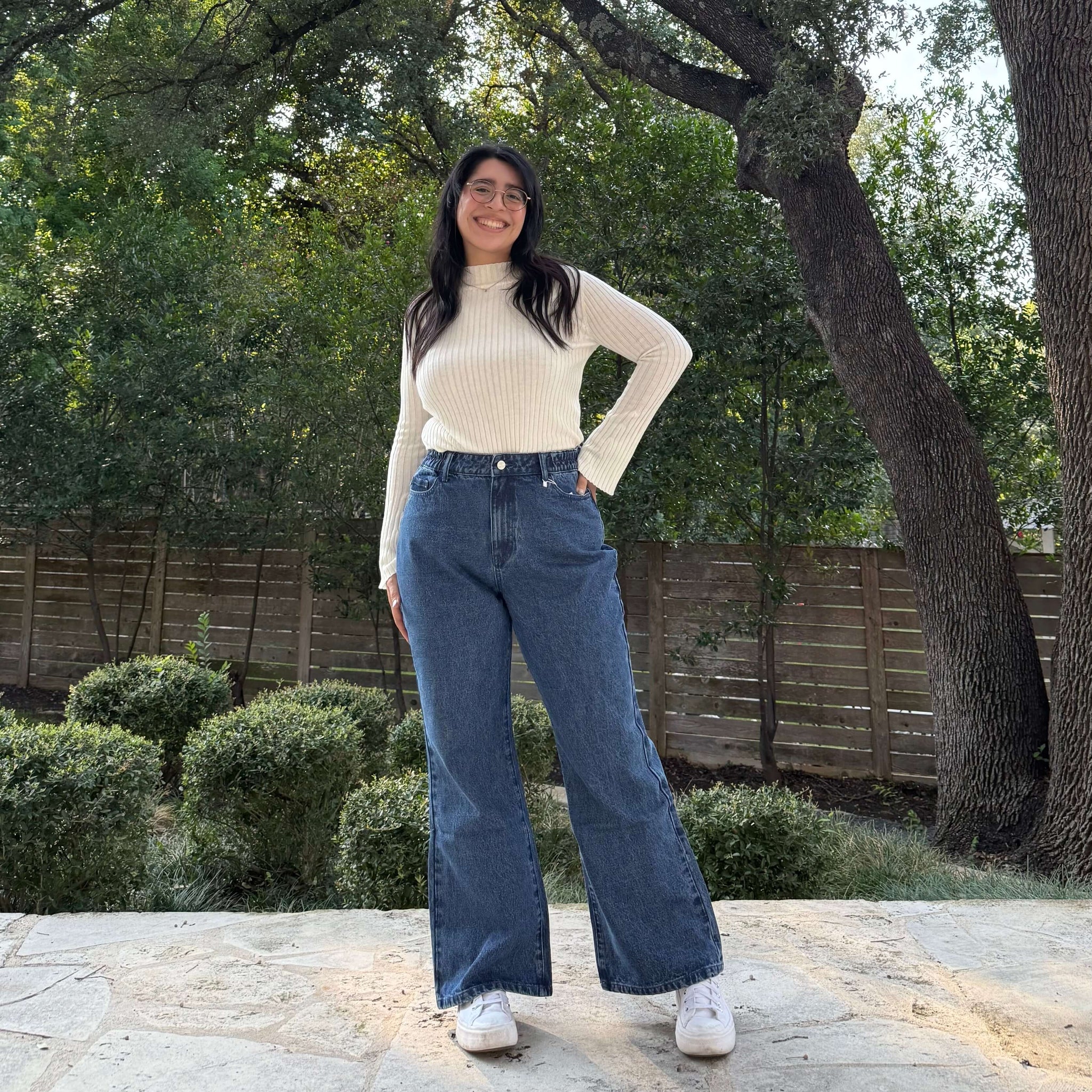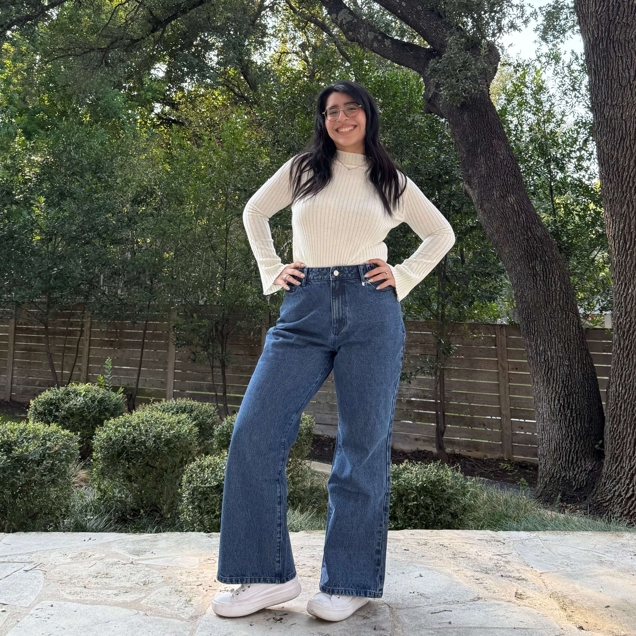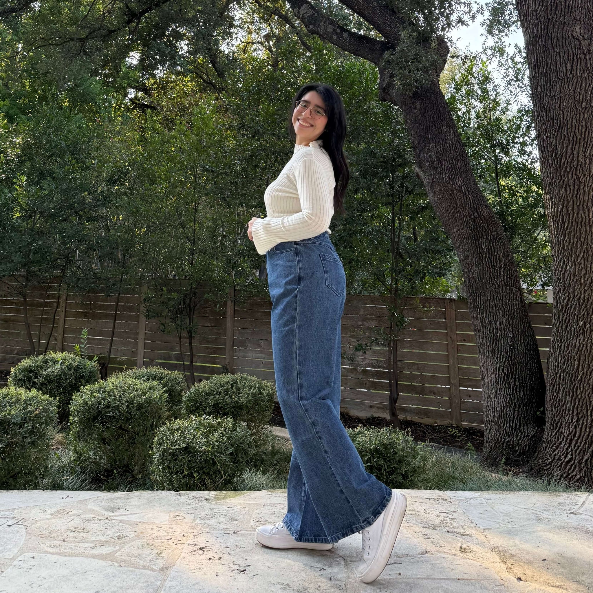 The jeans are meant to be fitted at the waist and a bit loose around the legs.